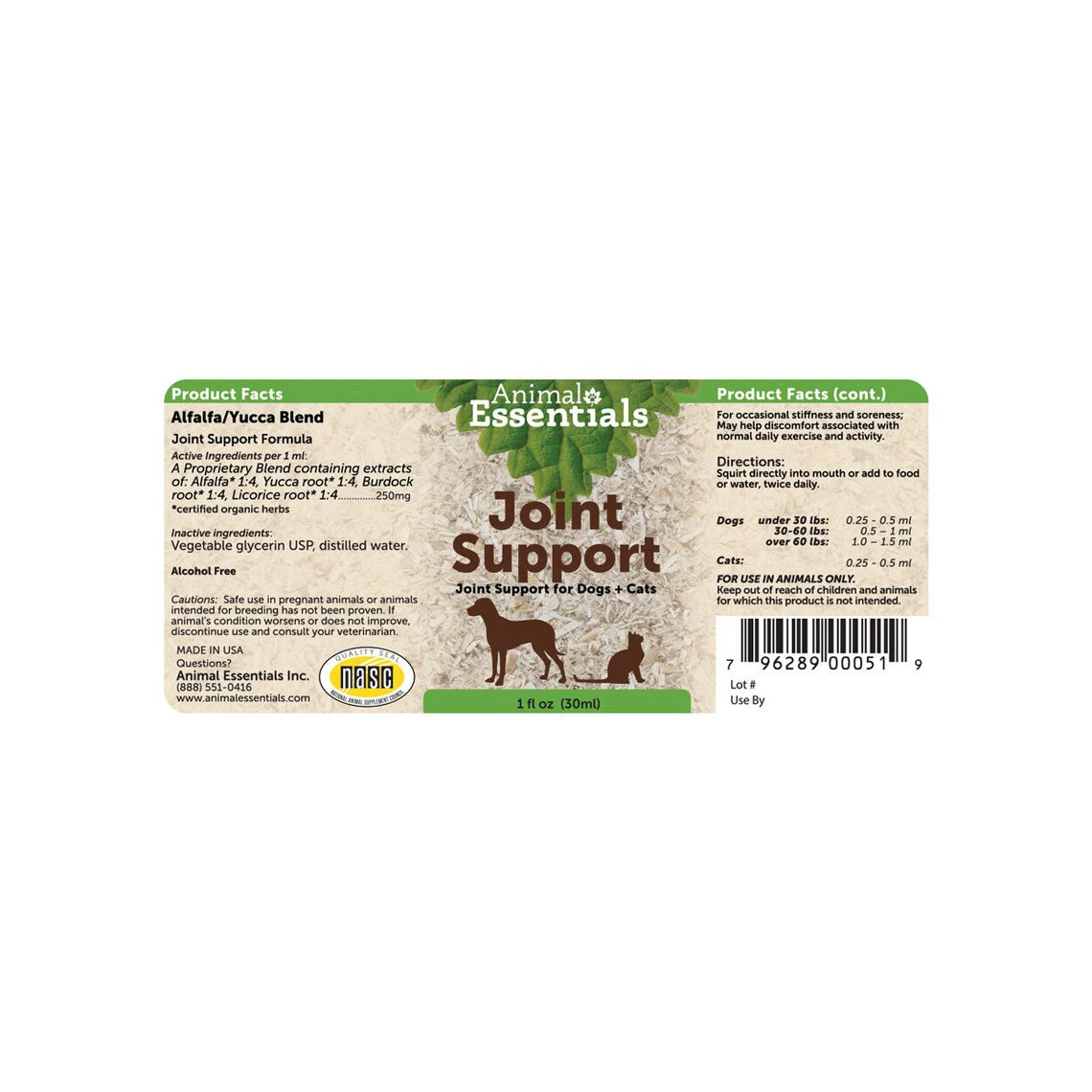 Animal Essentials Joint Support is designed to promote joint mobility for pets during normal exercise, ease stiffness and soreness, and maintain a healthy inflammation response. This alcohol free liquid herbal formula can be added to food, water, or squirted directly into the mouth for easy dosing and administration.