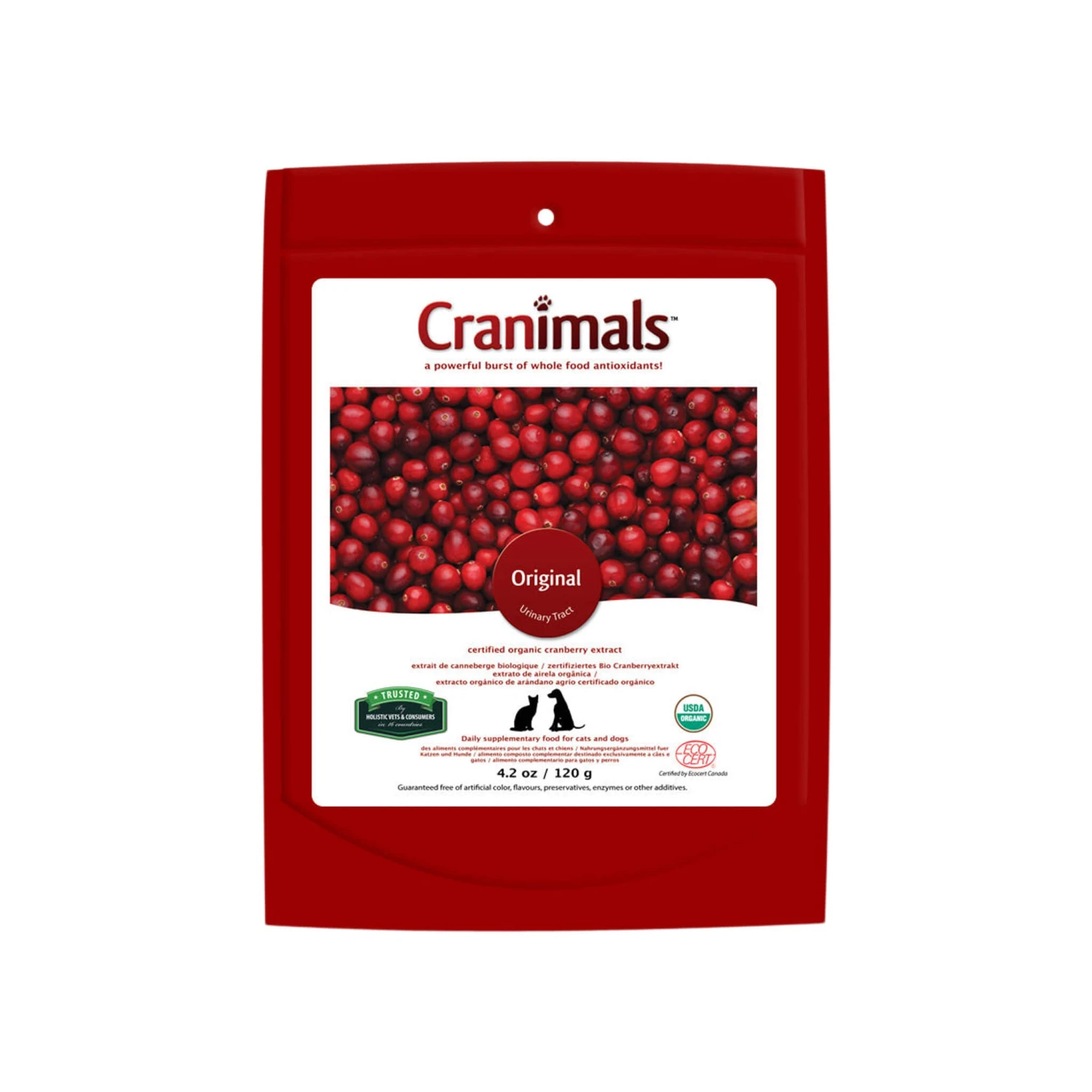 Cranimals Urinary Supplement or Dogs and Cats is made from certified organic cranberries. Cranberries contain proanthocyanidins (PAC’s) which support your pet’s ability to inhibit the adhesion of Escherichia coli, the bacteria responsible for 80-90% of urinary tract infections. Cranimals Original is especially suited for animals in need of bladder and kidney support. PAC’s support dental health by maintaining low levels of plaque on teeth and gums. The phytochemicals found in cranberries are also great for cellular health and a healthy inflammation response.