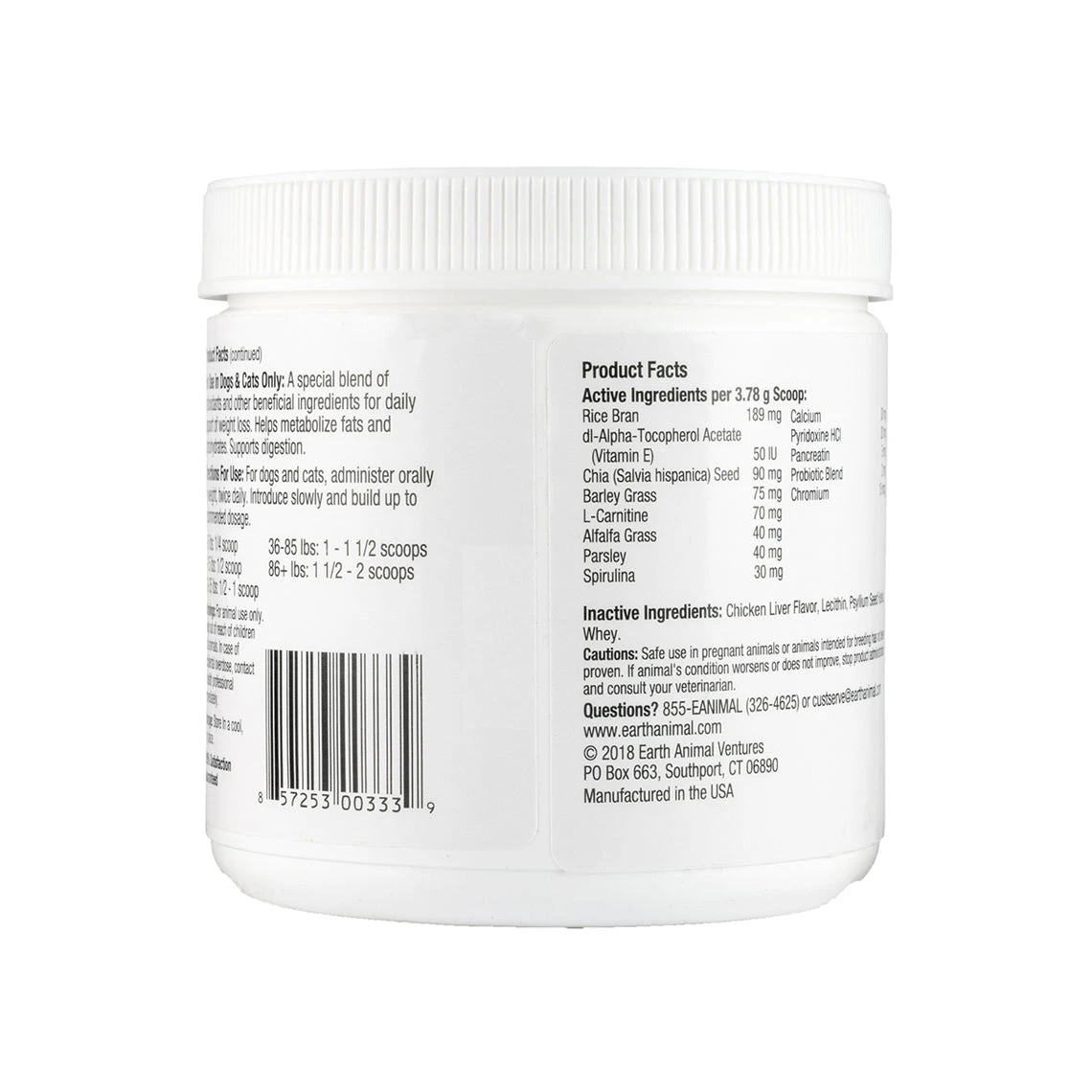 Earth Animal Healthy Weight Nutritional Supplement Powder is for daily support supplement for natural weight loss as well as aiding in metabolizing fats and carbohydrates. The formula includes Rice Bran which helps maintain healthy weight, blood sugar levels & reduces the risk of heart disease. Chia is high in antioxidants & 0-3 fats, L-Carnitine can help with fat metabolism to help keep your pet lean.