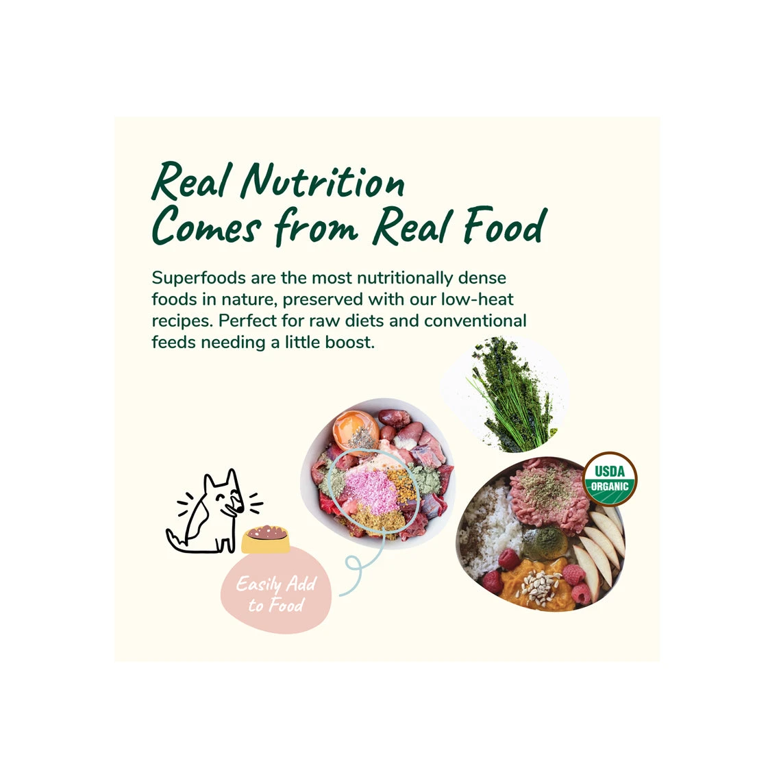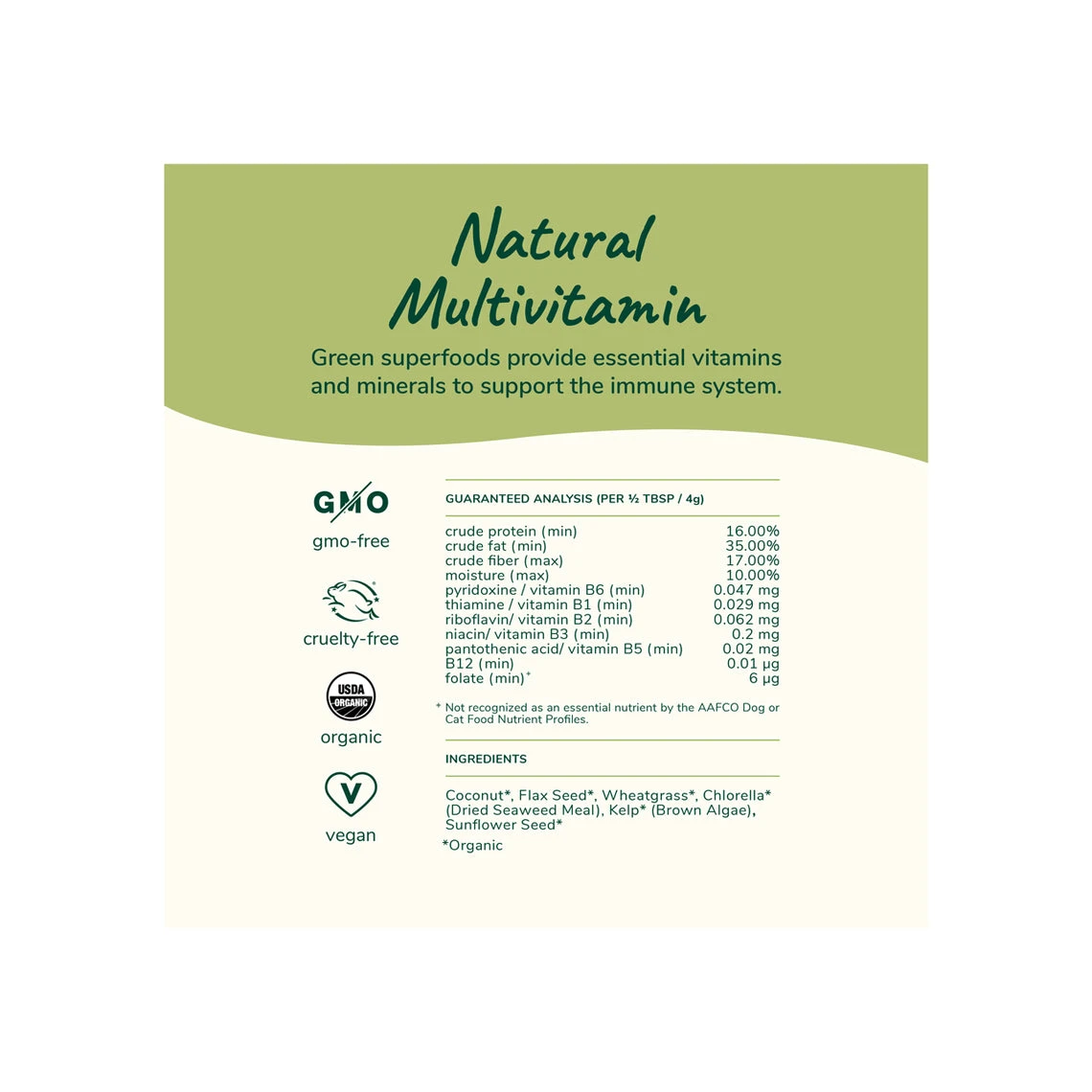 Your pet will have a soft silky coat after using this nutrient dense supplement. Featuring wheatgrass and seaweed, this non-GMO, grain-free formula provides a huge dose of essential vitamins and minerals that your pet’s food may be lacking. Since the formula features only whole food ingredients its a tasty treat to add on top of their food.Â