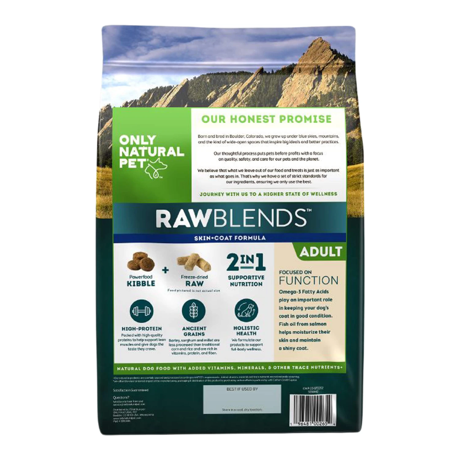 Only Natural Pet Raw Blends Skin and Coat Dog Food is a high-protein, legume free, dry dog food with ancient grains and raw inclusions. Featuring two foods in one, it has an ancient grain-inclusive kibble with sorghum, barley, and millet, combined with freeze-dried raw superfood bites.