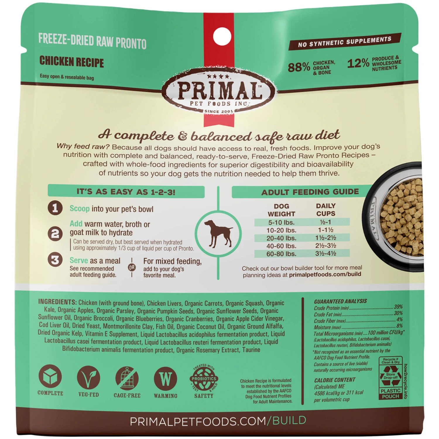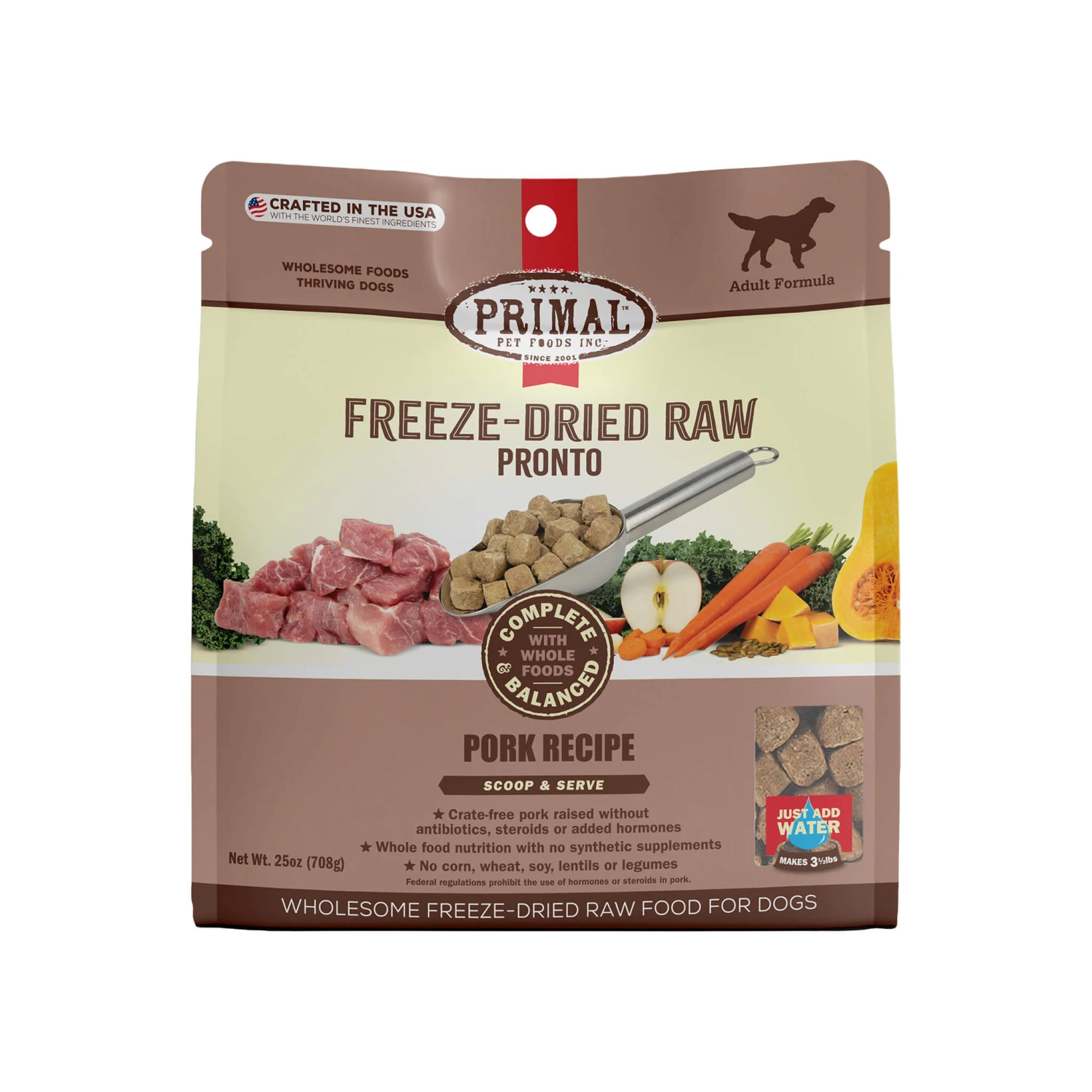 Primal Pet Foods Pronto Freeze-Dried Raw Dog Food is a complete and balanced dog food with real whole food nutrition with no synthetic vitamins or minerals. This freeze dried raw dog food is highly digestible, which supports maximum nutrient absorption. Primal Pronto is a great way to give your dog the raw experience while being shelf stable.